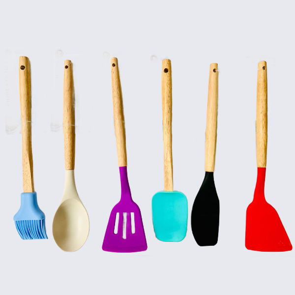 12-piece silicone kitchen utensil set with wooden handles.