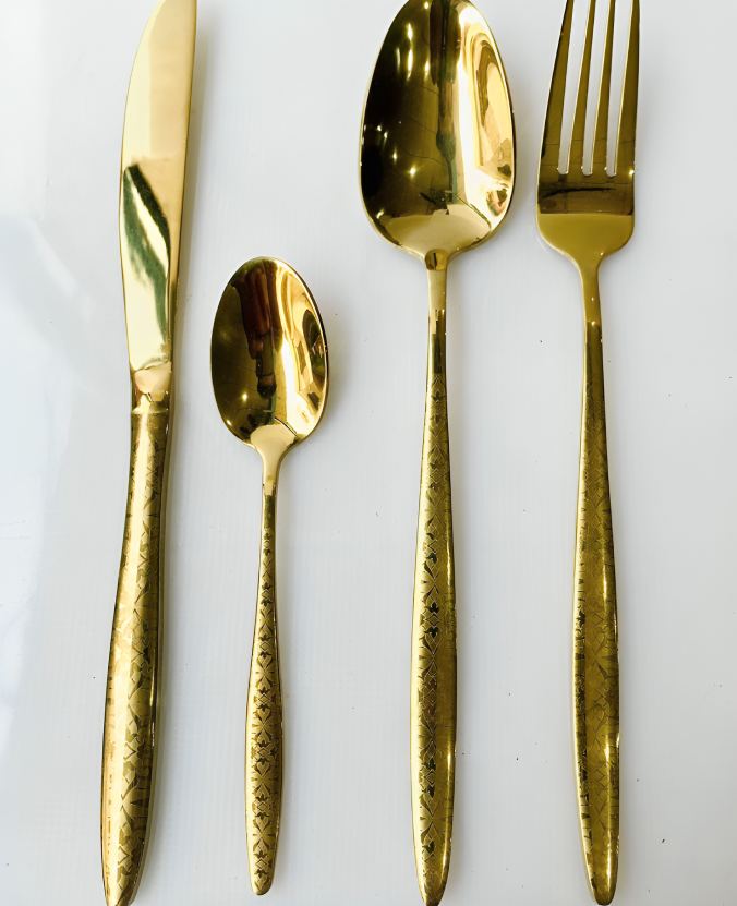 A set of gold-plated stainless steel cutlery without a stand.