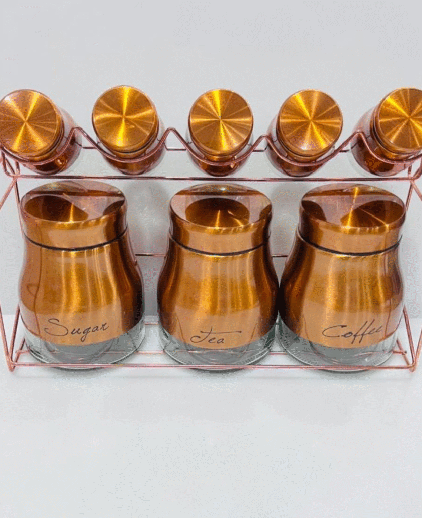 Jar set with a rack for sugar, tea, and coffee.